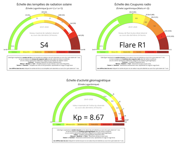 An X1.9-class solar flare that occurred on January 18 at 18:09 UT (Figure 1) generated a very fast solar storm directed towards Earth, causing a geomagnetic storm that began on Monday night and continued into Tuesday. This storm produced beautiful auroras that were observed in France. The INSU National Observation Services (including our solar instruments – BCMT – and space instruments and our MEDOC, CDPP, STORMS, and ISGI data services), in close collaboration with the French Organization for Applied Research in Space Meteorology (OFRAME), continuously monitor these phenomena.
