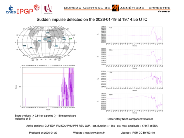 The shock wave reached the vicinity of Earth at around 21:20 UT yesterday evening, with a measured arrival speed of approximately 1000 km/s and a magnetic field intensity greater than 50 nT (Figure 2). A sudden magnetic pulse was observed at all ground-based magnetic observatories starting at 19:14 UT, coinciding with strong variations in the direction of the interplanetary magnetic field upstream of the shock wave (Figure 2). This pulse was strongest over Africa, with a variation of 178 nT in about ten minutes, which is quite exceptional for this type of phenomenon. The magnetic variations measured on the ground in the following hours (Figure 2) resulted in high magnetic activity indices (aa: 502 nT; am: 533 nT; Kp = 9-; Ds: -158 nT).